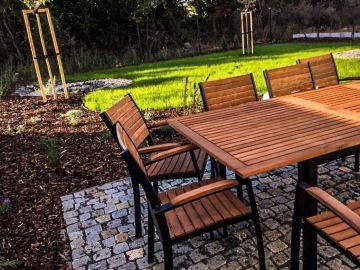 Velkorysá zahrada s terasou zve k dlouhým večerům pod hvězdami i pohodovým odpoledním siestám. Soukromí a klid v srdci Mikulova doplňuje posezení, kde si můžete vychutnat sklenku vína nebo večeři s přáteli. Prostor, který vás zve zpomalit a užít si atmosféru jižní Moravy naplno.