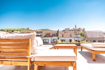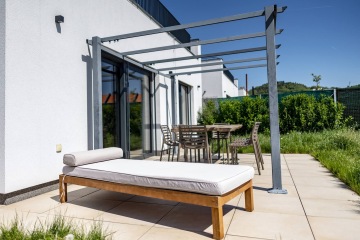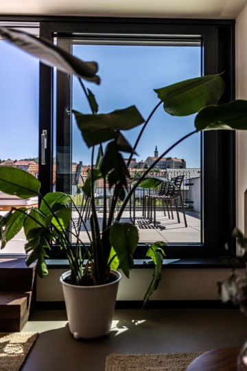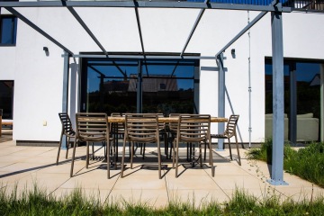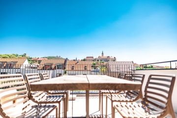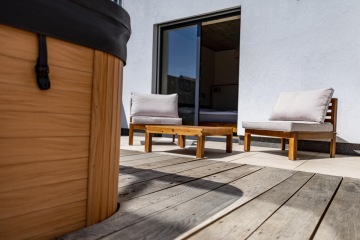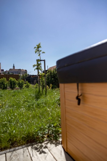 Velkorysá zahrada (přízemní vilabyt) nebo prostorná terasa (horní vilabyt) s výhledem na zámek Mikulov zve k posezení i odpočinku na lehátkách. Užijte si soukromí a klid, které podtrhují atmosféru místa. Ideální pro pomalá rána s kávou i večery pod hvězdami s vínem z jižní Moravy. Přízemní apartmán navíc nabízí vířivku.